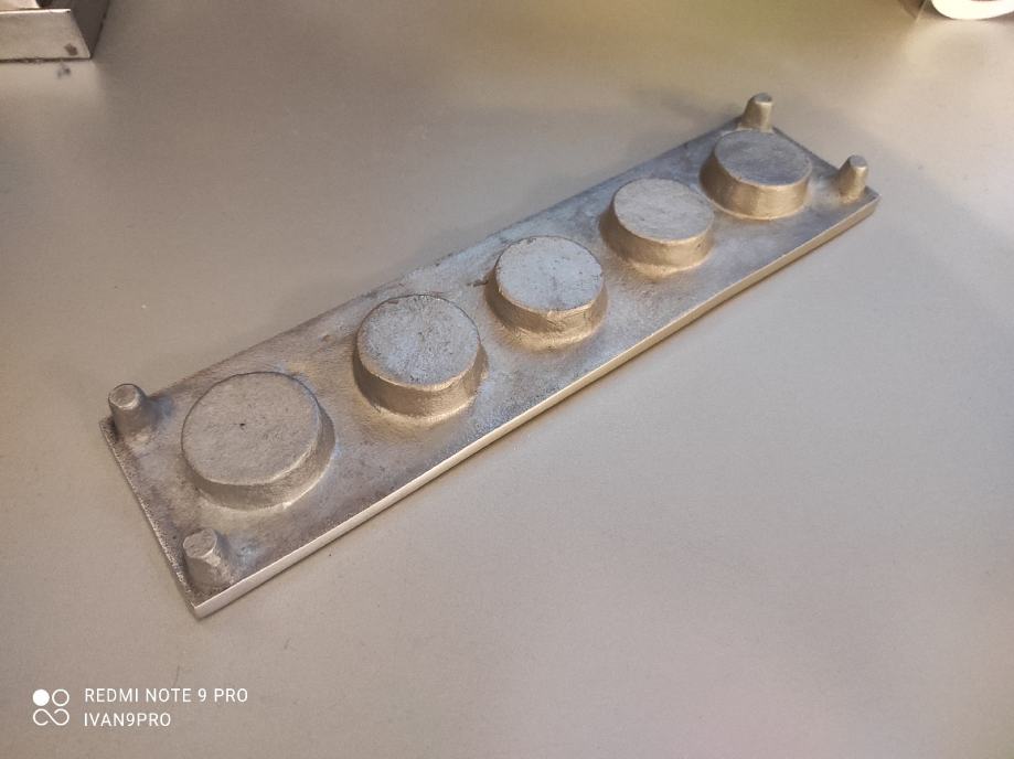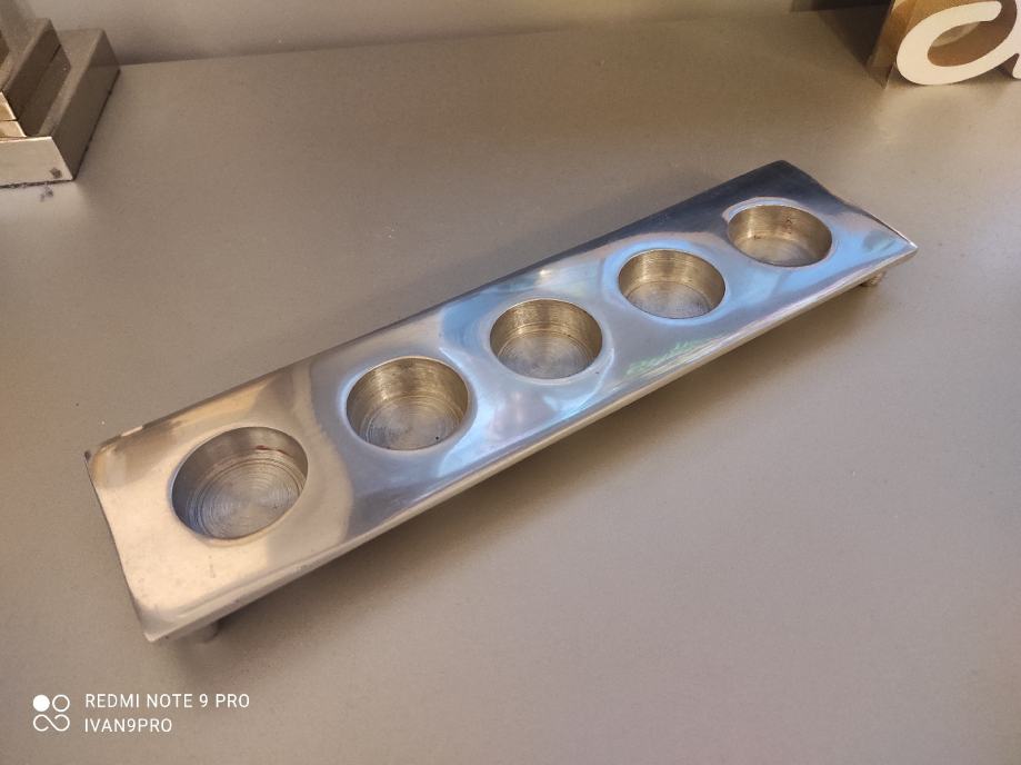 Prodajem rabljenu dekoraciju, od metala. Duljina 32cm, širina 8cm, visina 2cm. Teška 415g. Otvori promjera 4 cm.