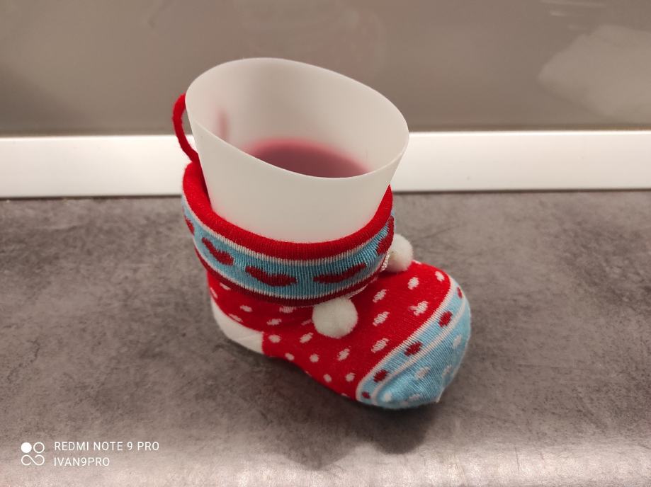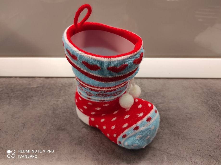 Mala čizmica, unutrašnja strana je plastična, a vanjska periva tekstilna. Visina 12cm, duljina 12cm. Gornji otvor 7x5 cm.