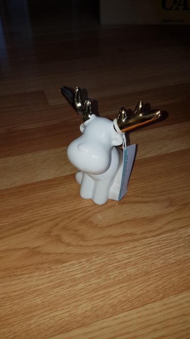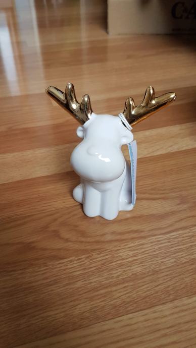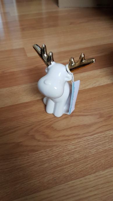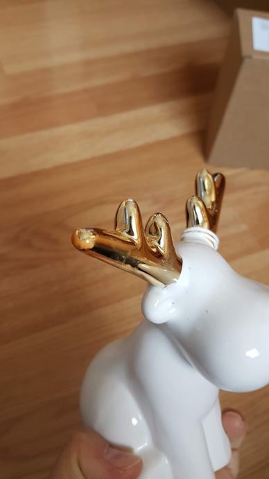 U potpunosti nova i nekorištena figurica soba, naručena sa stranice Sinsay, još s etiketom i u originalnom pakiranju. Bijele boje sa zlatnim rogovima. Dimenzije: 11 cm x 10 cm x 13 cm, materijal: keramika. Na 5. slici vidljivo da malo nedostaje zlatne boje na vrhu i uz donji rub desnog roga, što se niti ne primjeti iz daljine (tako je došao kad je kupljen), ostalo je sve uredno.