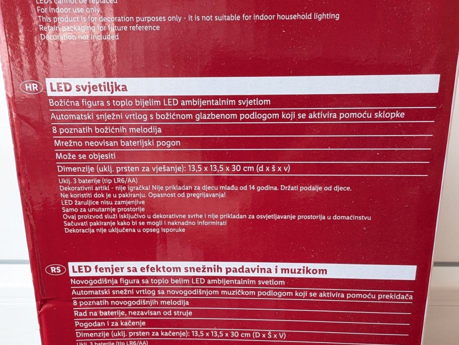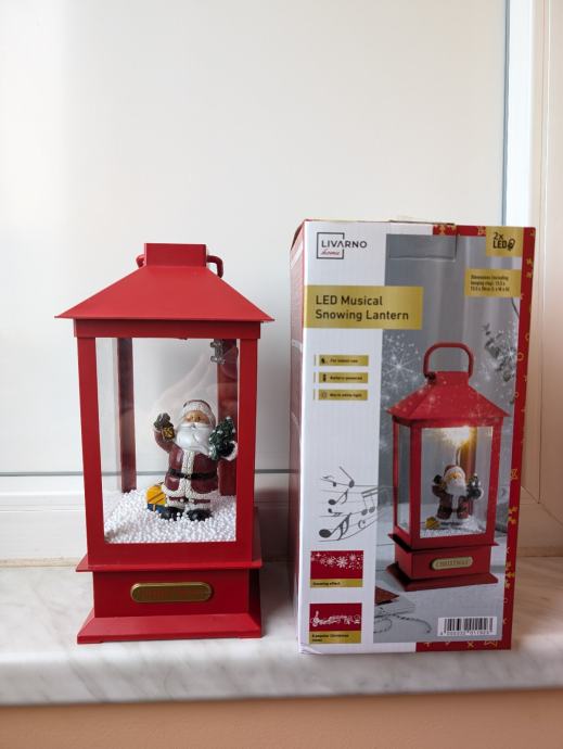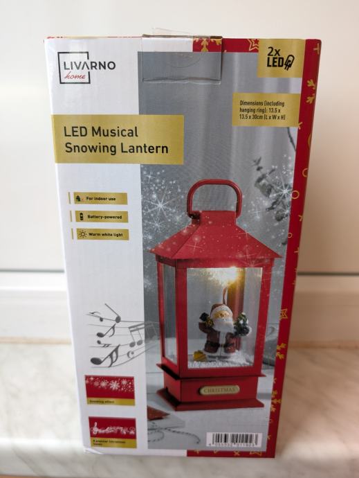 Led svjetiljka s efektom padanja snijega i glazbom, svira 8 poznatih božićnih melodija. Može se objesiti.