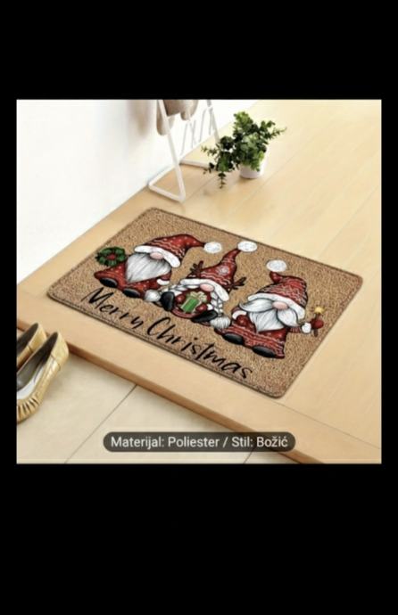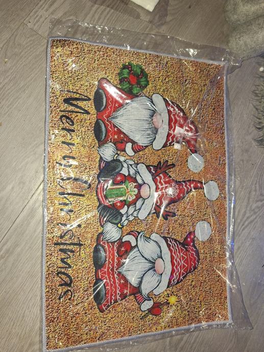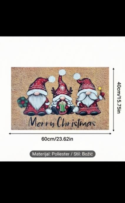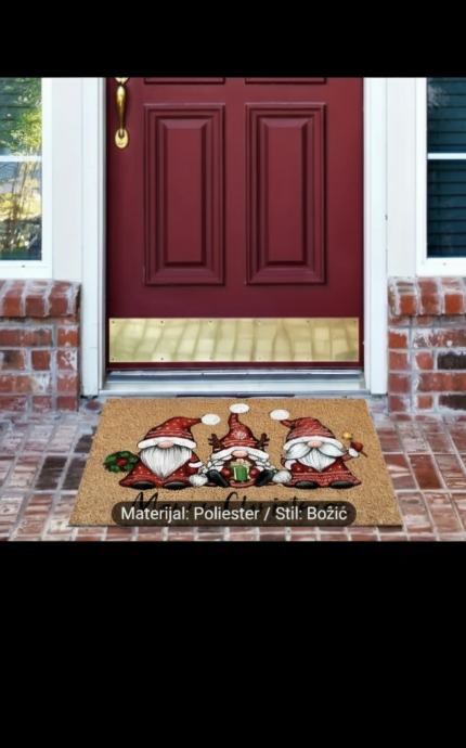 Prodajem potpuno novi, nekorišteni Božićni otirač koji će vašem domu odmah dati topli blagdanski ugođaj! Ovaj otirač nije samo praktičan, već je i presladak dekorativni komad s tri simpatična božićna gnoma (patuljka) i natpisom 'Merry Christmas'.