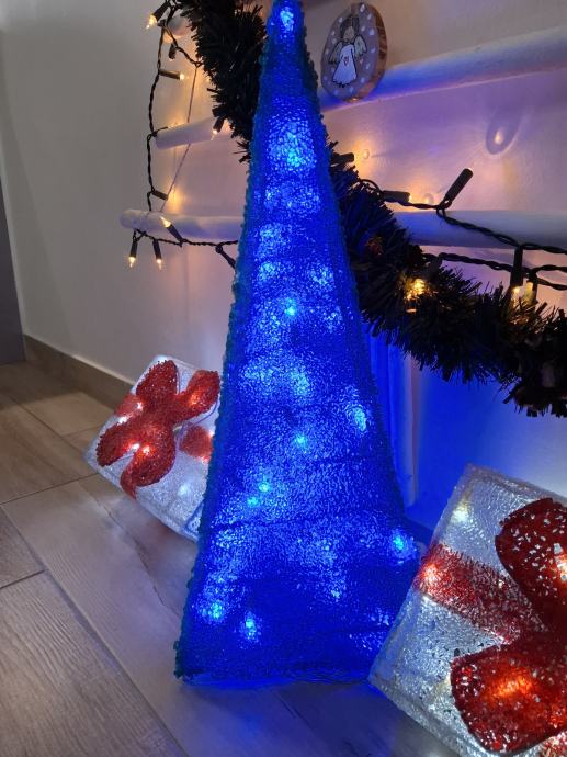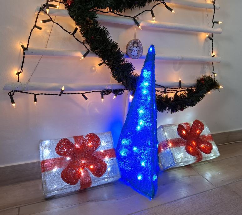 Dva poklon paketa 21x15x30 cm i plavi ukras 50x26cm sa rasvjetom.