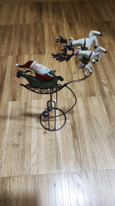 Figura Djeda Mraza zajedno sa saonicama se njiše naprijed-natrag na stalku.