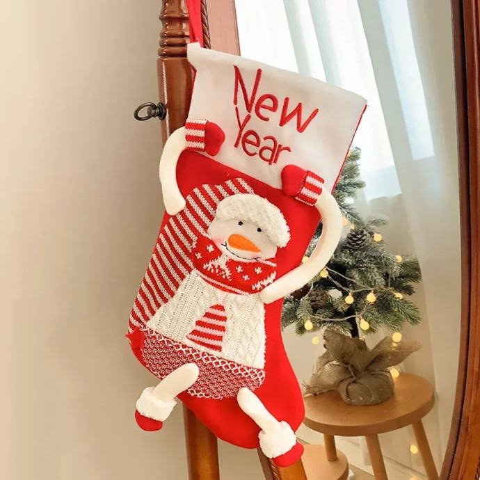 Velika pletena Božićna čarapa - poklon torba, Djed Mraz, Snjegović