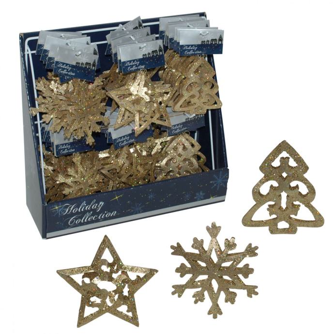 Dostupne su 3 vrste: pahulja 9,5x9,5x1,5 cm, zvijezda 9,5x9,5x1,5 cm i bor 10x8x1,5 cm.