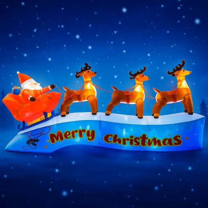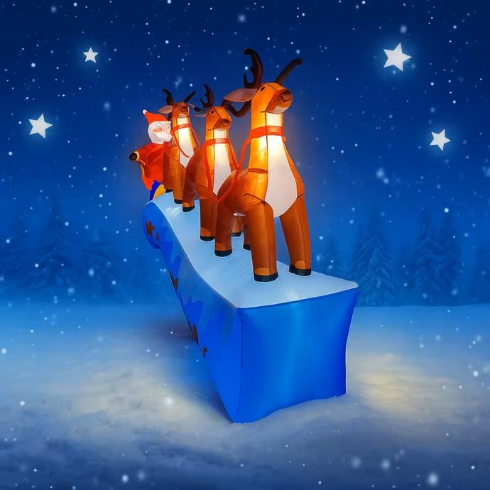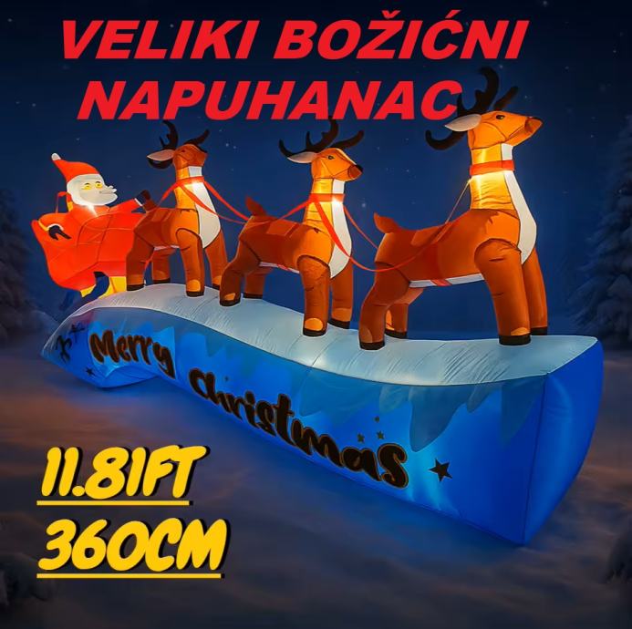 Veliki napuhanac BOŽIĆNI Djeda Mraza, sobovi, sa LED rasvjetom unutra.