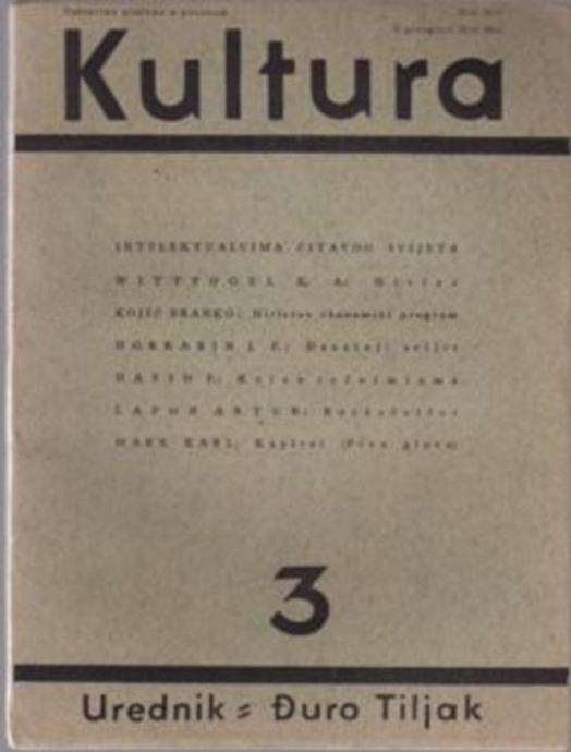 Kultura:naučno-umjetnički mjesečni časopis / vlasnik, izdavač i urednik Đuro Tiljak. Broj 3. Vrlo rijetko, i NSK ima samo prvi broj. Stanje - antikvarno odlično, bez oštećenja. Romain Rolland - Intelektualcima čitavog svijeta, Wittfogel o Hitleru, Branko Kojić, Horrabin, Artur Lafon, Karl Marx - Kapital, prva glava. Likovno prilozi - Petar Dobrović, Sreten Stojanović
