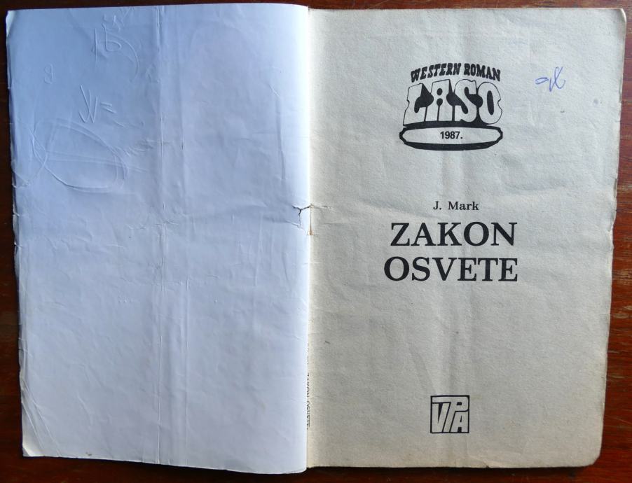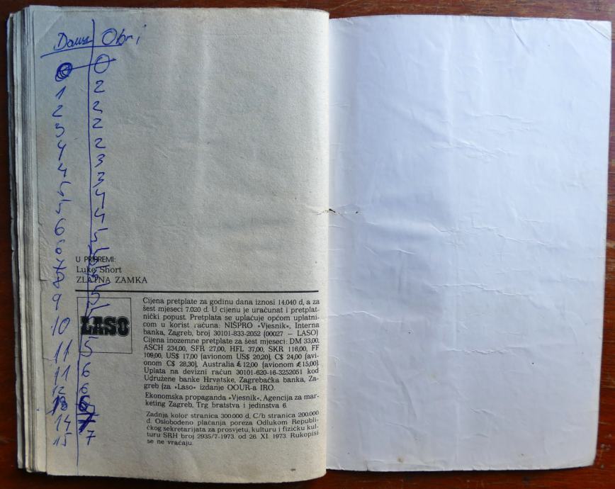Roman iz 1987. godine. Kemijska na naslovnici te pri vrhu predlista i prve stranice. Na zadnjoj stranici (nakon romana) pisani rezultati kartanja.