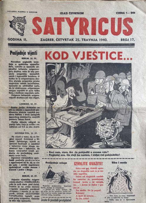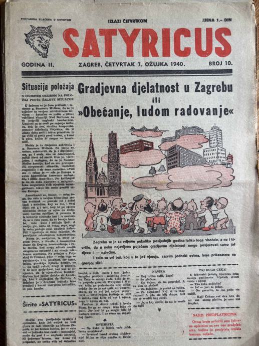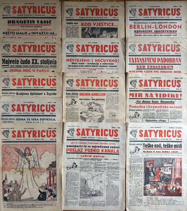 Prodajem 14 očuvanih brojeva satiričkog lista „Satyricus“ (veljača – listopad 1940.). Časopis je izlazio tjedno u Zagrebu, s kraćim prekidima i promjenama formata, od 1939. do 1945. godine.