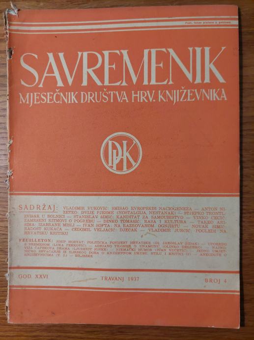 SAVREMENIK 4 , 1937.Mjesečnik društva hrv. knjiž. /Ur. : Luka PERKOVIĆ