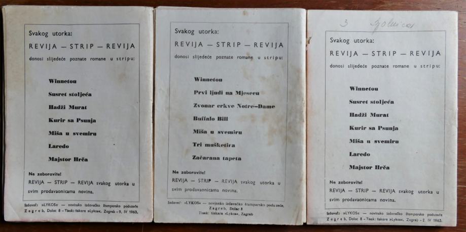 U lotu je 29brojeva: 3, 4, 5, 6 (nedostaje zadnja korica), 7, 8, 9,10, 11, 12 (oštećen pri vrhu), 13, 14, 15, 16, 17, 19, 20, 21, 22, 23, 24, 25, 26, 27, 28, 29, 31, 32 i 33.