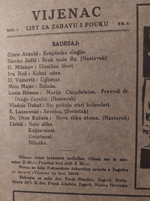 VIJENAC - list za zabavu i pouku 1923. / God. I. = Broj 5.