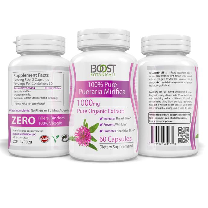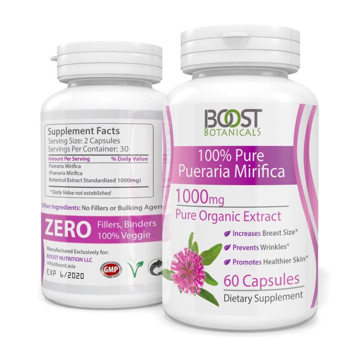 Boostov ekstrakt Pueraria Mirifca proizveden prema GMP smjernicama koristeći samo organske sastojke vrhunske kvalitete. Također pogodan je za vegetarijance i vegane te predstavlja izvrstan zdravstveni proizvod koji pruža mnoge zdravstvene beneficije.