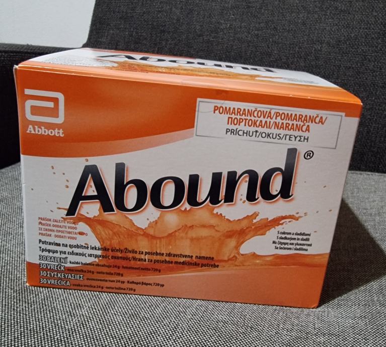 Prodajem Abound prašak/napitak, hrana za posebne medicinske potrebe. U neotvorenoj kutiji se nalazi 30 vrećica, svaka po 24g okusa naranče. Za upravljanje prehranom pacijenata koji trebaju izgraditi mišićnu masu i podržati zacjeljivanje rana. Abound je posebna zdrava hrana za oralnu ishranu ili hranjenje kroz sondu koja sadrži mješavinu arginina, glutamina i beta-hidroksi beta-metilbutirata (HMB).