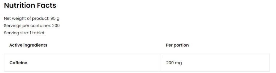 CAFFEINE 200 MG se sastoji od 100% čistog kofeina u obliku tablete. Kofein pomaže poboljšavanju koncentracije i budnosti što je od izuzetnog značaja u svim sportovima, kako sportovima snage tako i u sportovima izdržljivosti za poboljšanje performansi.