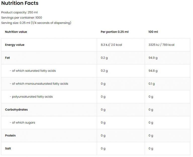 Jednostavan za primjenu, te u preporučenoj količini od 1 potiska praktički ne sadrži kalorije, masnoće ili kolesterol.