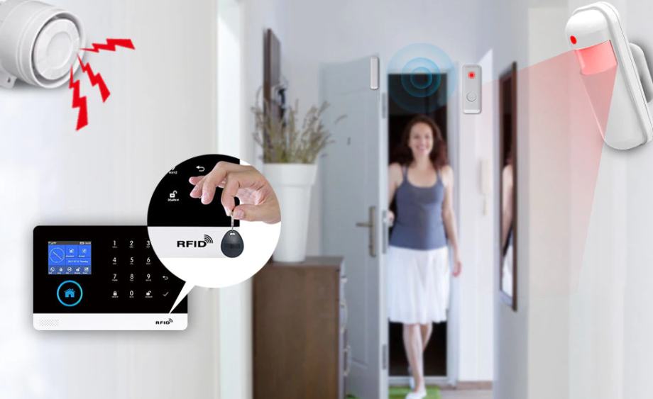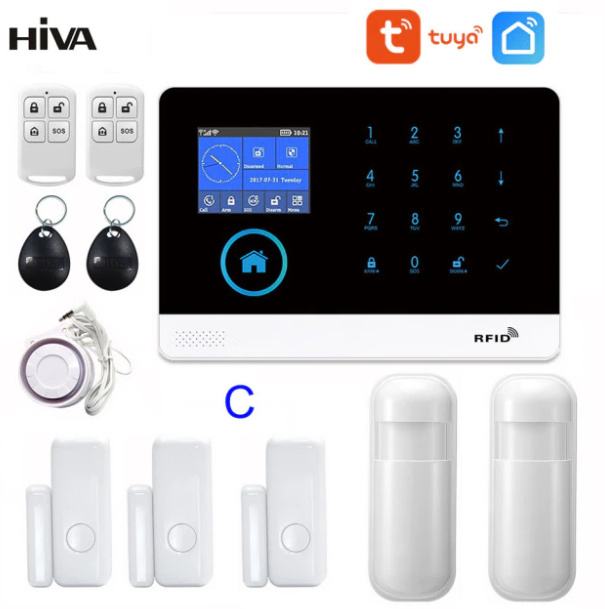 Bežični pametni alarmni sustav. Iznimno jednostavan za spajanje te nisu potrebne preinake doma ili majstori. U paketu se nalazi centralna jedinica, 3 alarma za vrata i prozore, 2 detektor pokreta, 2 daljinska upravljača, 2 RFID zaštita, 1 eksterna sirena.