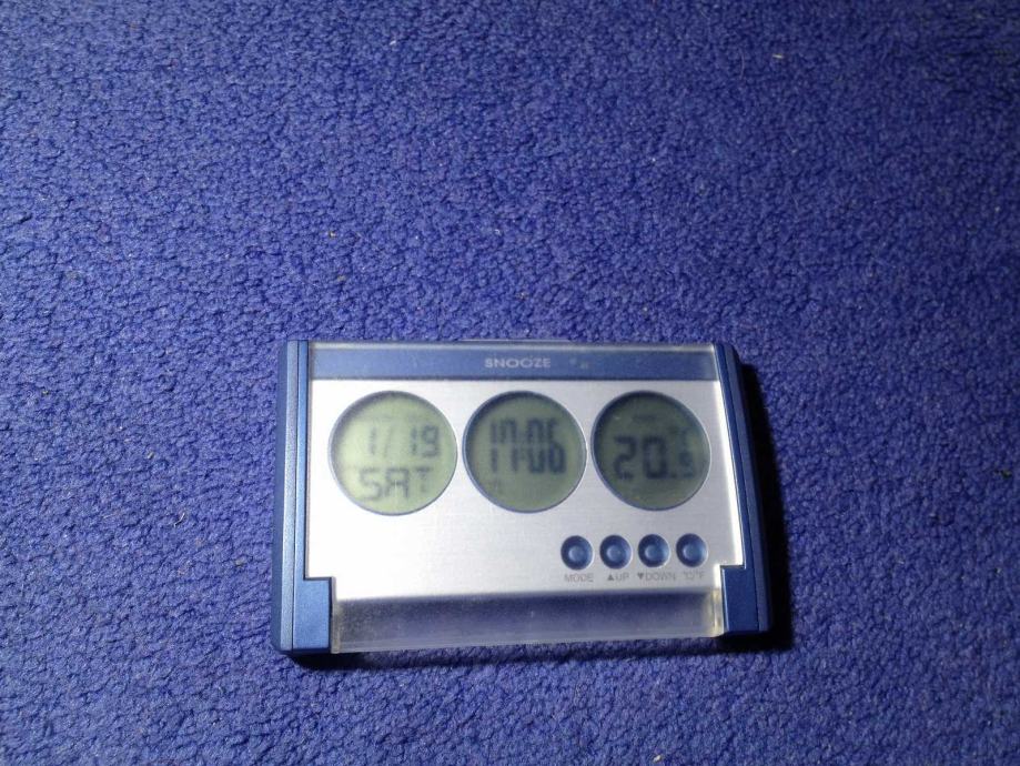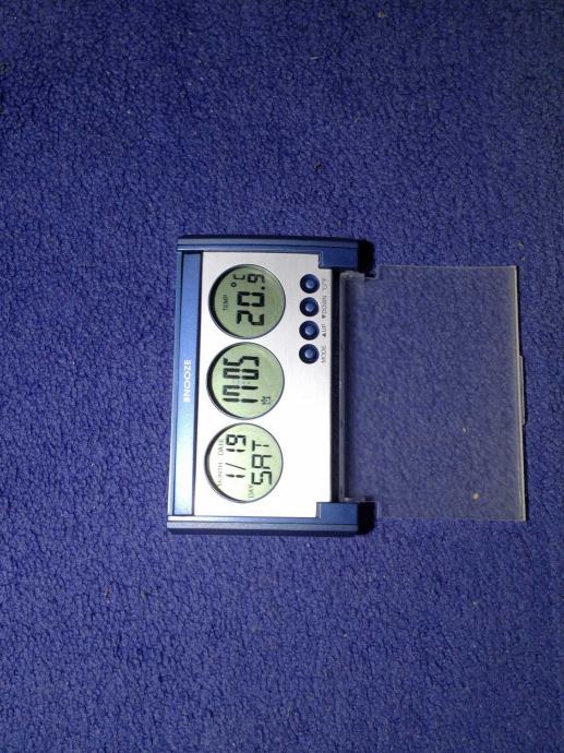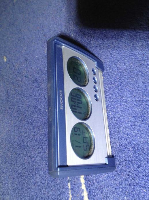 Prijenosni mali sat, budilica, mjerač temperature, datum.