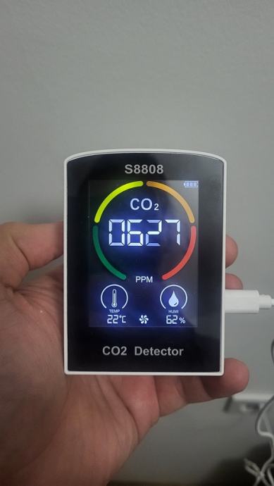 Pokazuje koncentraciju CO2, temperaturu, vlažnost, oznaku kvaitete zraka u boji.