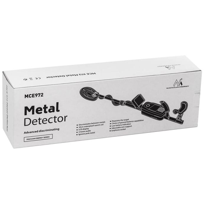 Maclean MCE972 jedan je od najnaprednijih detektora metala renomirane tvrtke Maclean Energy.Opremljen velikom vodootpornom zavojnicom od 220 mm, proizvod se odlikuje visokom preciznošću čak i u najtežim okruženjima.Velik, lako čitljiv digitalni zaslon informira korisnika o svim bitnim informacijama.MCE972 je visoko konfigurabilan s 12 razina osjetljivosti, ručnim balansiranjem tla, značajkom preciznog određivanja i nekoliko načina rada, što ga čini izvrsnim svestranim uređajem koji nikada neće zakazati dok ste na terenu.Visoko optimizirana potrošnja energije omogućuje da se uređaj napaja pomoću samo dvije alkalne baterije od 9 V.Vodootporna zavojnica 220 mm, veliki LCD zaslon (75 x 40 mm), diskriminacija metala s trotonskim audio signalom, 12 razina osjetljivosti, indikator niske baterije, 6.3 mm izlaz za slušalice, kretanje, način rada bez kretanja, detektor dubine s 12 razina, značajka punktiranja, ručno podešavanje ravnoteže tla. Napajanje preko dvije 9V baterije (nisu uključene u pakiranje), radna frekvencija 6,7 kHz.Dubine pretraživanja: mali predmeti poput kovanica: 17 cm – 25 cm, predmeti srednje veličine poput pištolja: do 40 cm, veliki predmeti poput viteških oklopa: 80 cm, ekstremno veliki objekti, poput oklopnih vozila: do 200 cm