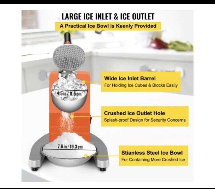 - S povećanom ulaznom cijevi za led i proširenom ulaznom rupom za led promjera 4,5 inča (11,5 cm), naš električni aparat za snježne kupe može lako primiti više leda. U njega možete sipati male kockice leda i velike blokove leda. Što je veći kapacitet leda, to se više struganog leda može proizvesti. Ova drobilica leda može vam pružiti mekani, pahuljasti i praškasti snježni led, uz pomoć šireg ulaza, većeg kapaciteta, snažnog motora i dvostruko oštrih noževa.