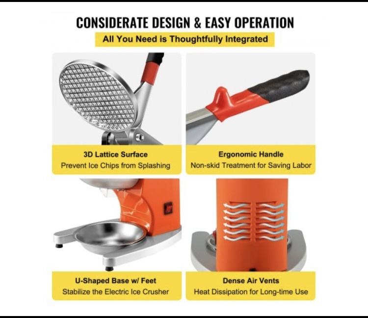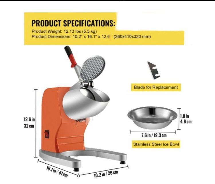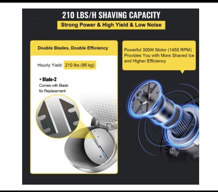 - Naš električni aparat za brijanje -drobljenje leda ima veću učinkovitost i učinak po satu zahvaljujući dizajnu s dvije oštrice, što mu omogućuje udvostručenje učinkovitosti brijanja leda u usporedbi s onima s jednom oštricom. Pokretan bakrenim motorom od 300 W, čija brzina vrtnje doseže 1450 RPM, naš aparat za led može proizvesti 95 kg na sat, brzo zadovoljiti hitne potrebe u kratkom vremenu. Osim toga, za zamjenu je predviđena još jedna oštrica.
