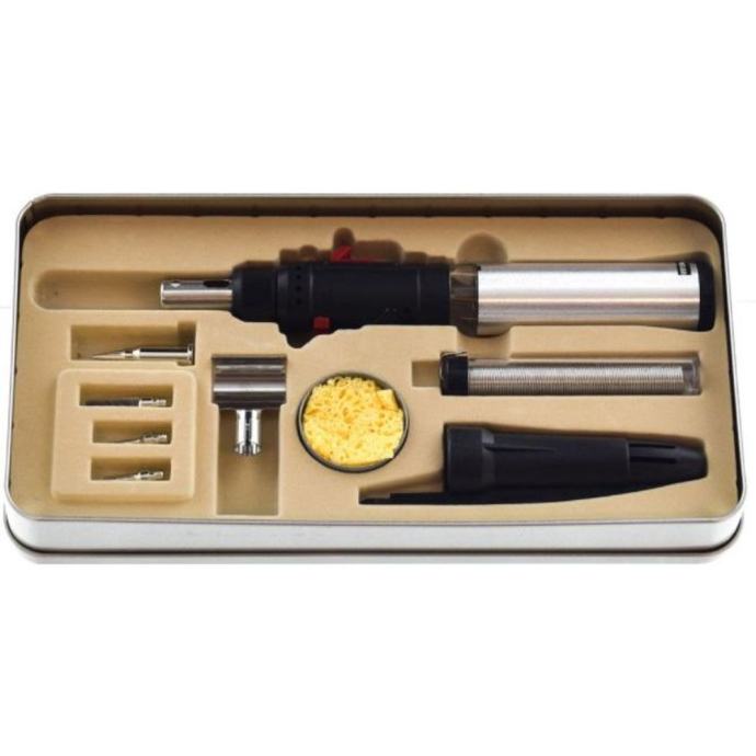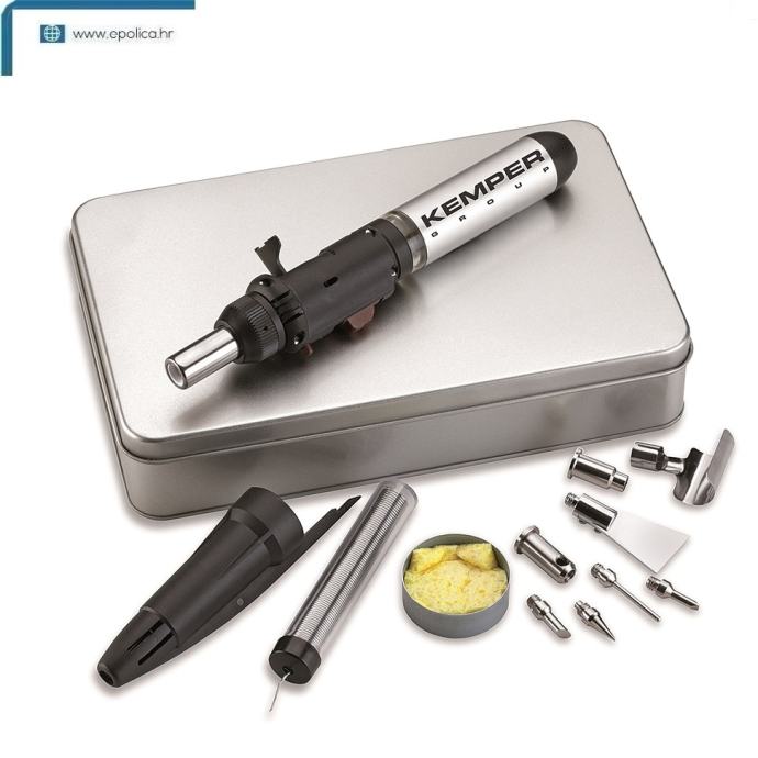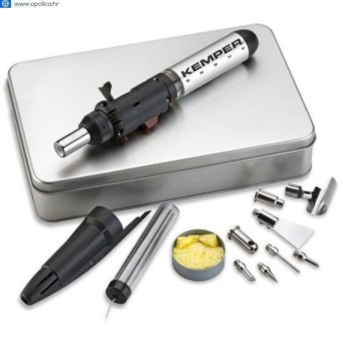 Plinska lemilica. Može se koristiti kao lemilica, mini brener, alat za pirolitično crtanje po drvetu i sl. Puni sa sa plinom za upaljače art.4535. Lemilo plinsko set mini KEMPER 12100KIT