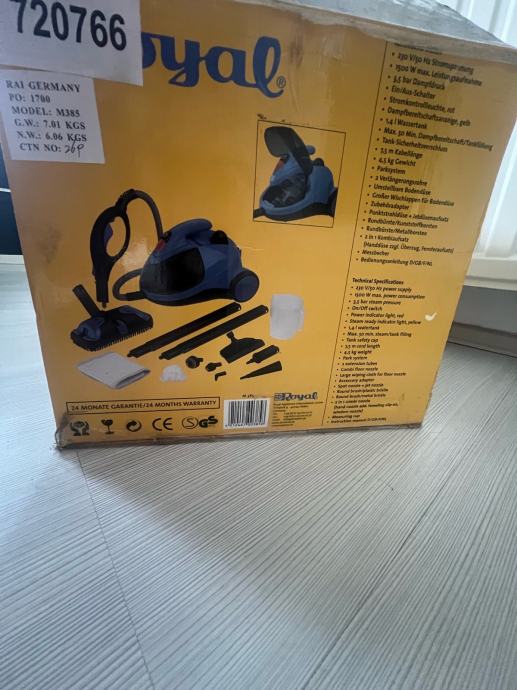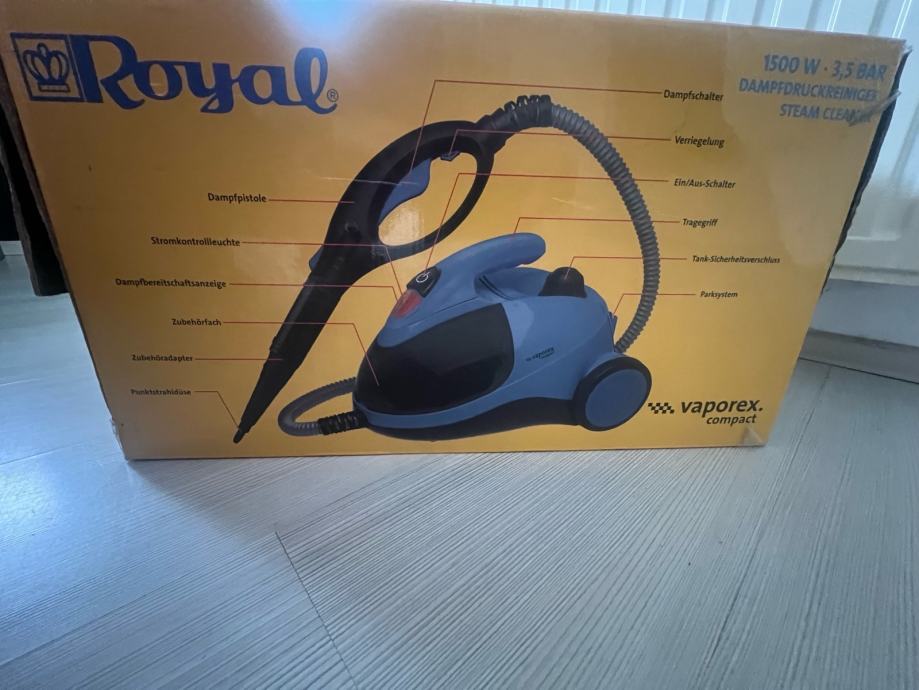 Prodajem Royal parni čistač marke Vaporex Compact. Snaga uređaja je 1500W, a tlak pare 3,5 bara. Uređaj je namijenjen za čišćenje raznih površina u domu pomoću pare, od podova i pločica do kuhinjskih površina i sanitarija. Dolazi s raznim nastavcima i četkama za različite namjene. Parni čistači omogućuju temeljito i higijenske čišćenje bez kemikalija, samo uz pomoć vrele pare.