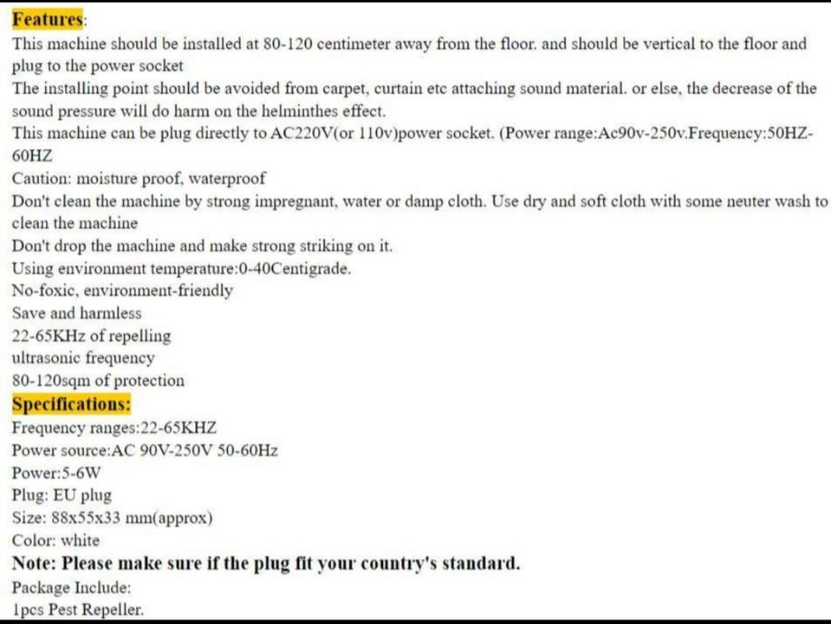 Novo,više komada!Pest Reject - utrazvučni uređaj koji radi na elektromagnetskim valovima ZA TJERANJE GLODAVACA I INSEKATA - PEST REJECT .Neograničen rok upotrebe. Tjera iz vaše kuće i neposredne okolice muhe, komarce, buhe, leptire, žohare, mrave, miševe i štakore. Radi na 220V - nisu potrebne baterije. Boja: Bijela