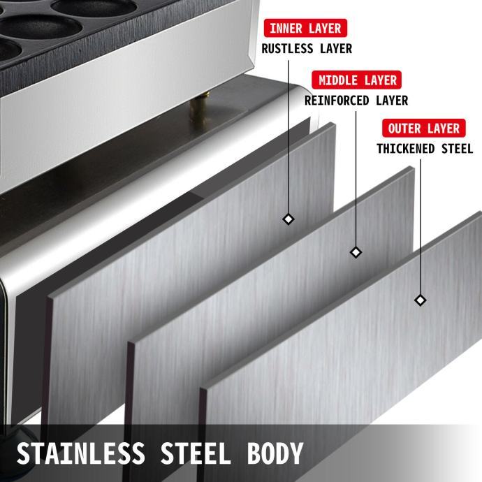 Glavno tijelo ovog aparata za palačinke izrađeno je od visokokvalitetnog zadebljanog materijala od nehrđajućeg čelika, atraktivnog izgleda, jednostavnog za čišćenje i izdržljivog.