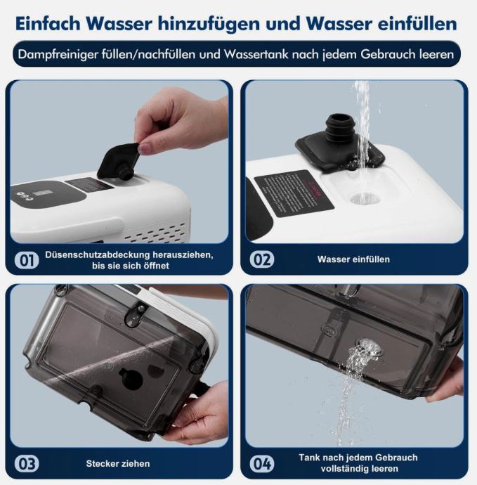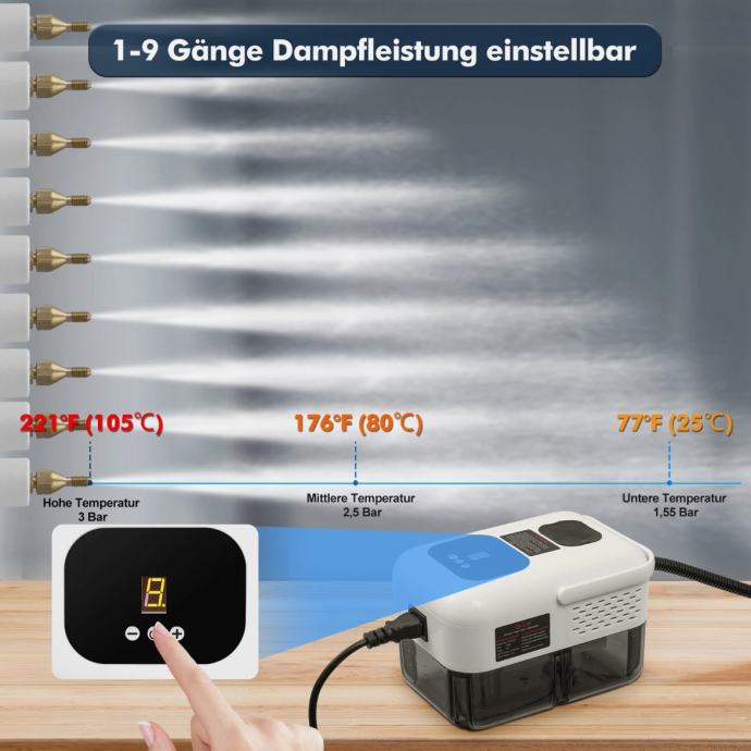 Dizajn s 9 postavki temperature: Visoktlačni Parni Čistač ima poboljšano dodirno upravljanje s 9 podesivih razina, što vam omogućuje jednostavno podešavanje intenziteta pare i vlažnosti pomoću tipke "+" ili "-". Ova fleksibilnost osigurava savršene performanse za vaše specifične potrebe čišćenja.