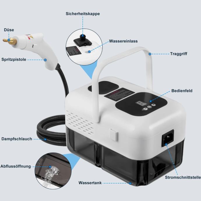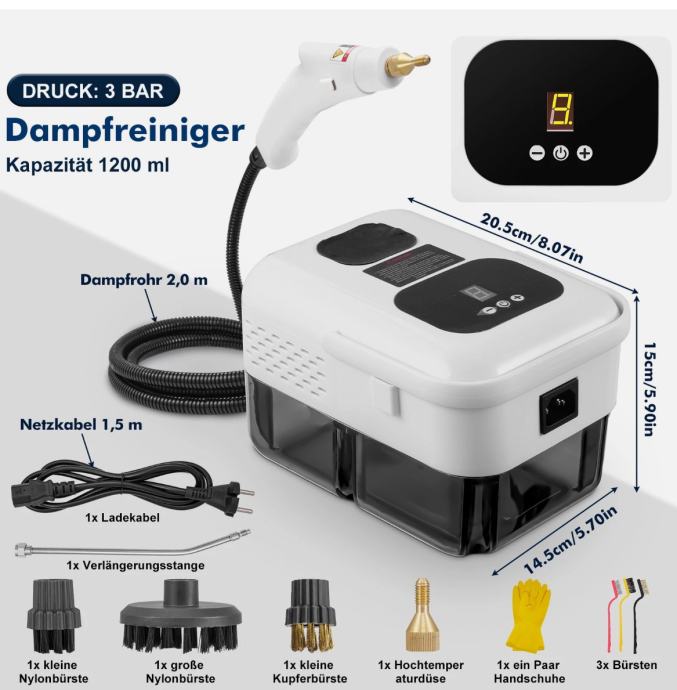 Prijenosni čistač: Visoktlačni Parni Čistač opremljen je crijevom za izlaz pare od 2 m i kabelom za napajanje od 1,5 m, što ga čini jednostavnim za nošenje i fleksibilnim za korištenje, omogućujući vam da ga lako premještate iz sobe u sobu i čistite teško dostupna mjesta u vašem domu.