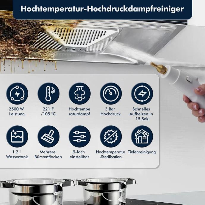 Snažan visokotemperaturni parni čistač Opremljen snagom od 2500 W, naš visokotemperaturni parni čistač može dosegnuti 105 °C za samo 10 sekundi pri tlaku od 3 bara. Učinkovito uklanja prljavštinu, nečistoće, prašinu i mrlje s raznih površina, olakšavajući vam svakodnevno čišćenje bez potrebe za kemikalijama.