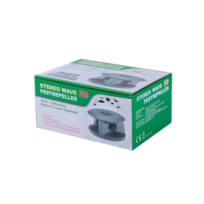 COMBOSONIC 3D STEREO RASTJERIVAČ je jedinstven i inovativan rastjerivač nametnika. Kombinira kut od 180°vertikalnih ultrazvučnih valova kako bi dodatno pojačao efekt kuta od 260° dva zvučnika u horizontalnom smjeru. Inovativan dizajn 3D STEREO WAVE RASTJERIVAČA omogućuje najbolje rasprostiranje ultrazvučnih valova u prostoru kako bi se postigla uvjerljivo najbolja zaštita od nametnika. Većina nametnika i insekata će biti otjerana iz zahvaćenog prostora ovim uređajem