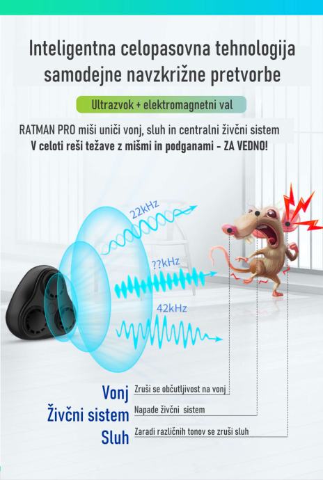 Zaboravite na klopke, otrove i stres. Stiže **RATMAN PRO** – najnapredniji **ultrazvučni uređaj za tjeranje glodavaca** koji trajno štiti vaš dom od miševa, štakora i kuna.