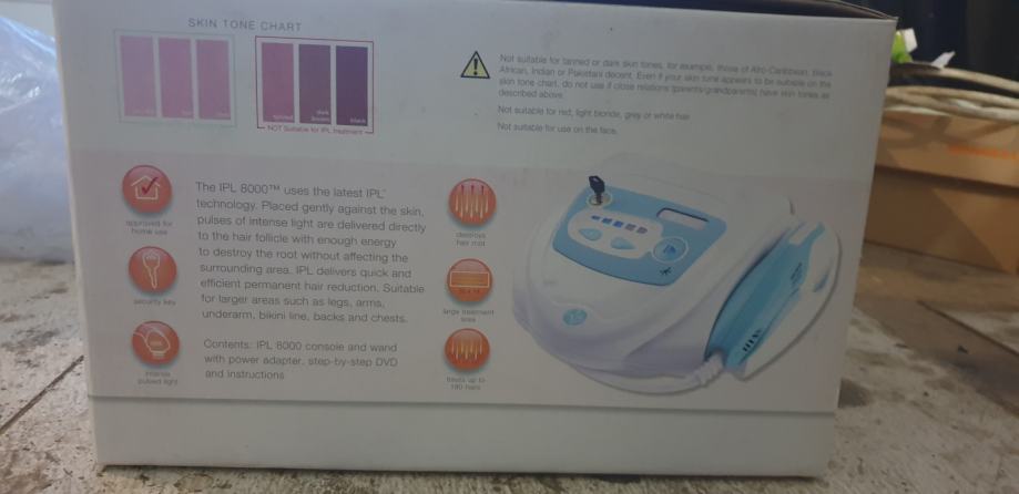 Uređaj za uklanjanje dlačica pulsirajućim svjetlom za njegu vašeg tijela u udobnosti vašeg doma. Bez rizika, bezbolno i trajno uklanjanje dlačica pulsirajućim svjetlom za noge, leđa, prsa, pazuhe, prepone... Koristi tehnologije specifične za institute ljepote, prilagođene za korištenje kod kuće. Koristi pulsirajuće svjetlo (IPL) za simultano tretiranje velikih površina: 15x35 mm za uklanjanje do 180 (4,9 cm²) dlačica odjednom. Energija pulsirajućeg svjetla koje emitira uređaj uništava folikule dlačica, za trajno uklanjanje dlačica zahvaljujući pojačanom sigurnosnom sustavu: - 8 sigurnosnih razina za potpuno bezbrižnu upotrebu. - Opremljen lampom od 30 000 bljeskova za uklanjanje dlačica na cijelom tijelu pomoću pulsirajućeg svjetla (pazusi + prepone + cijele noge u 6 sesija). Prigušivač (5 razina) - Uključen demonstracijski DVD. Osiguran je sigurnosni sustav s ključem i pristupnom šifrom. - Snaga: 6,5 J / cm² UV filter na području tretmana Ugrađen sustav hlađenja i automatsko zaustavljanje.