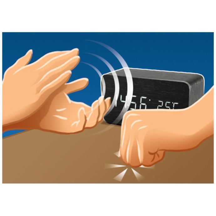 Digitalni sat sa alarmom, atraktivan dizajn, materijal izrade kućišta drvo, LED display sa prikazom sat / datum / temperatura, 12/24 format vremena, temperatura od 0 .....50°C, alarm " beep", interval 1 min, LED display je moguće ugasiti, aktivacija LED display-a u OFF modu na dodir, alarmom, pljeskanjem rukama. Napajanje AC adapter, ( 3 x AAA baterije), CR2032 baterija za memoriju sat/datum
