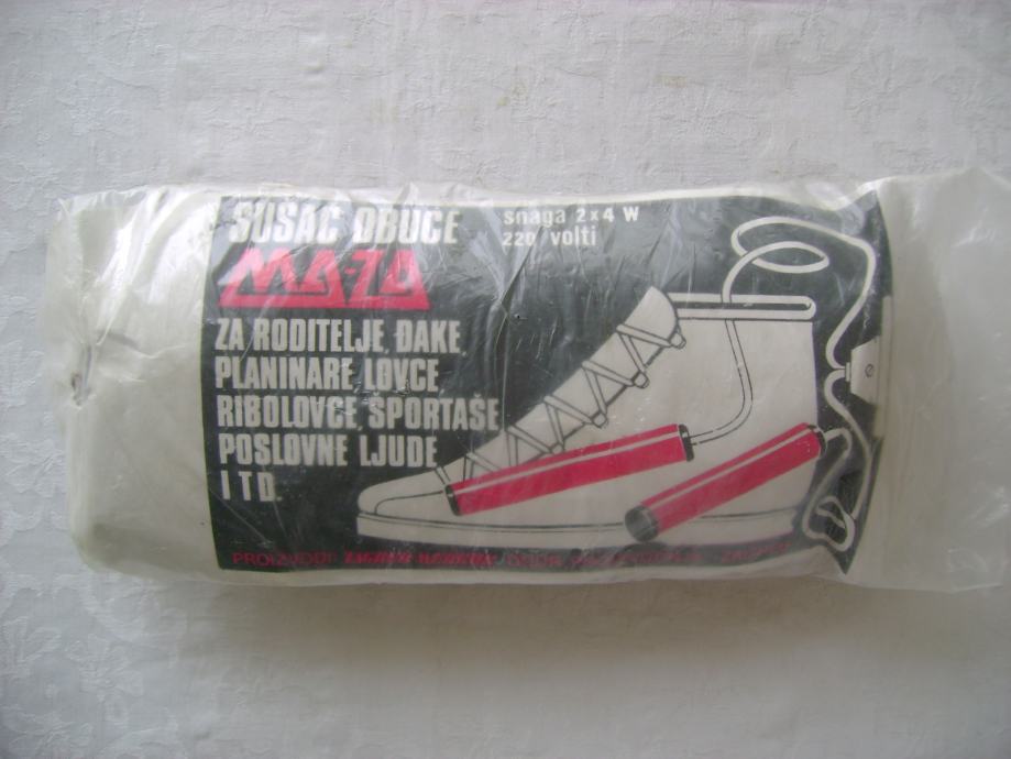 Sušač obuće Ma-Za - spravica za roditelje, đake, planinare, lovce i ribolovce, sportaše, poslovne ljude, itd., snaga 2 x 4 w, u originalnom (ne baš očuvanom) pakiranju.