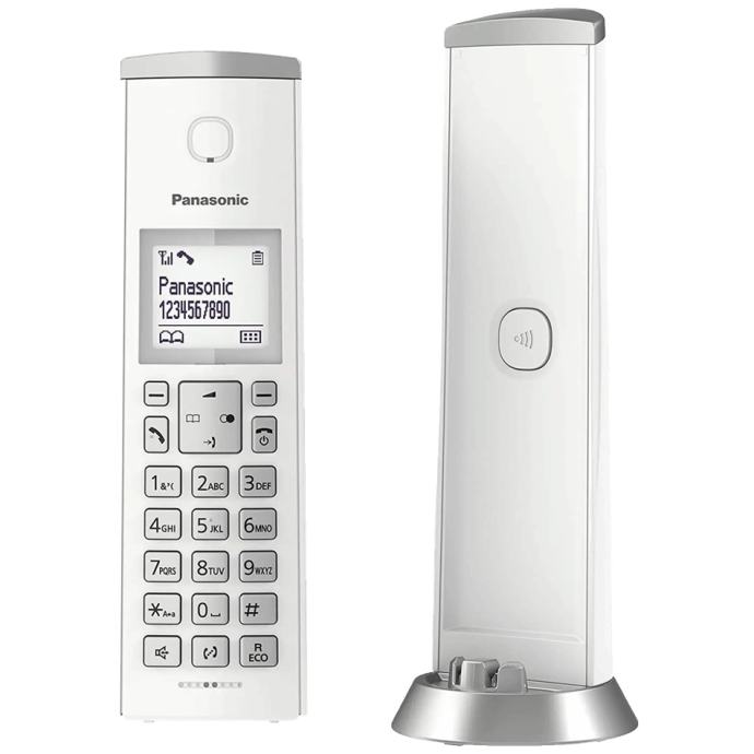 Bežični telefon, KX-TGK210FXW - Jedinstven i jednostavan dizajn telefona prirodno se uklapa u vašu prostoriju Zahvaljujući uspravnom položaju i kompaktonm dizajnu, ovaj će se telefon savršeno uklopiti u vaš interijer. Elegantna srebrna dorada odiše luksuzom. Uz elegantnu boju i mali LED pokazatelj dolaznog poziva savršeno će se uklopiti u vašu spavaću sobu. - Elegantno bijelo osvjetljenje Dizajnerski element zaslona čini bijelo pozadinsko osvjetljenje koje se slaže s jednostavnim i modernim jednobojnim kućištem. - Blokiranje neželjenog poziva Možete blokirati bilo koji navedeni broj, kao i bilo koji početni niz brojeva od 2 do 8 znamenki koji se poklapa s brojevima koje navedete. - Način rada "ne smetaj" Slušalica se može programirati da ne zvoni tijekom određenih vremenskih razdoblja tako da telefon ne zvoni kada spavate. - Jednodirni ekološki način rada Samo pritisnite gumb ECO. Izlazni signal smanjuje se za 90%, a potrošnja energije smanjuje se za otprilike 3.5% u usporedbi s normalnim načinom rada.