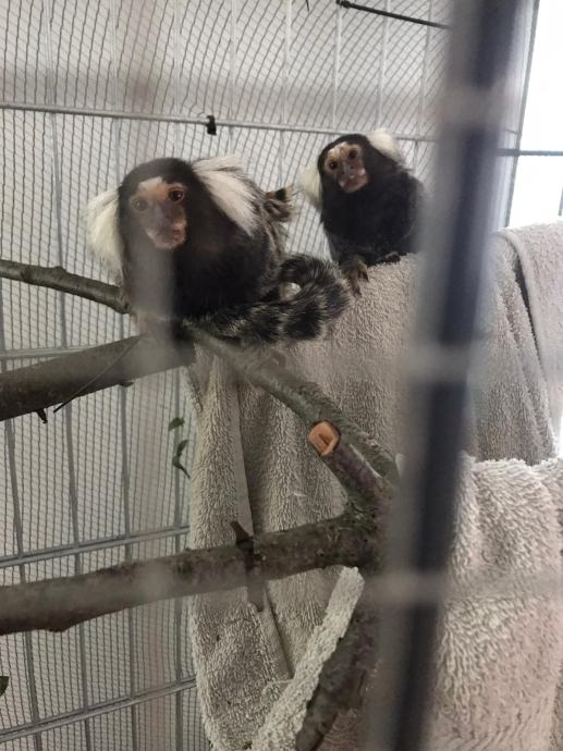 Par Marmoseta patuljastih majmuna, mužjak 3 godine, ženka 2 godine. Ženka gravidna. Imali su već jedno leglo. Zvati na broj 099 8156466.