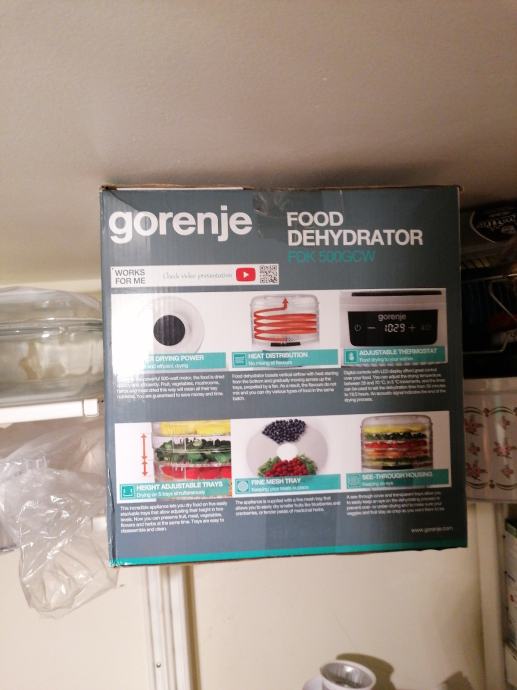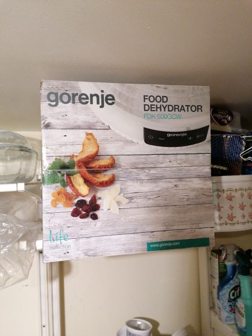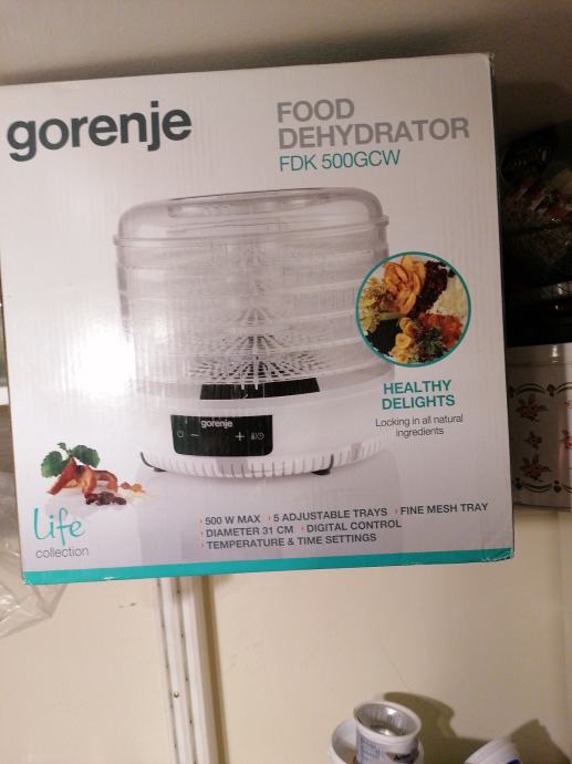 Dehidrator za začine, povrće, voće, gljive. Raspakiran, korišten nekoliko puta za sušenje zelenog začinskog povrća. Sušeno povrće može se samljeti i raditi vlastiti začin za juhe i variva. Kao što se vidi na slici ima više polica koje se slažu okomito ali se mogu koristiti i pojedinačno. Kod sušenja se može kombinirati sadržaj po policama bez mješanja mirisa i arome.