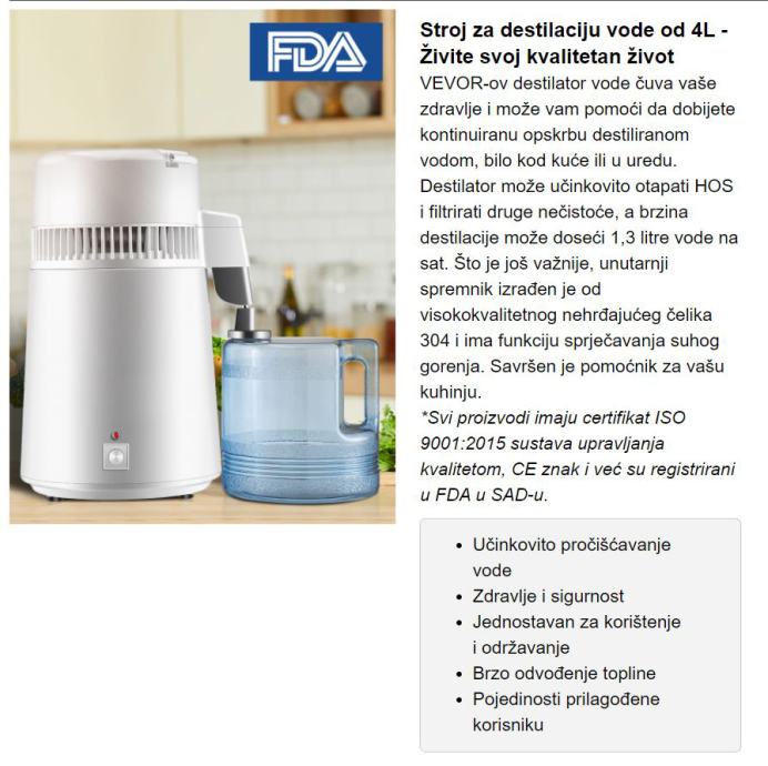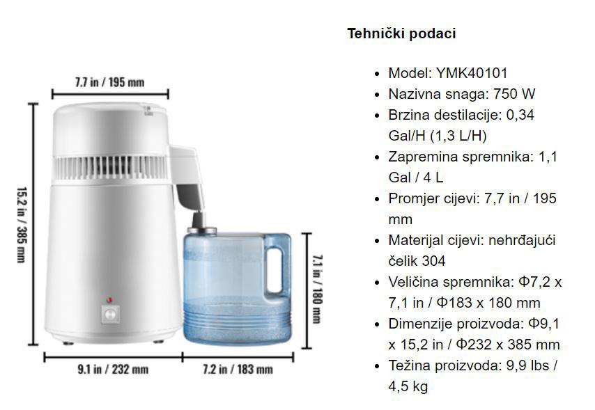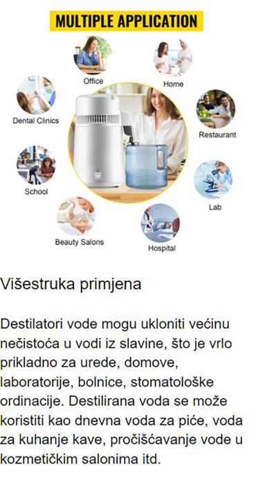 Učinkovito pročišćavanje vode: Razina snage: 750W; volumen: 4L/1,1 galon. Ovaj destilator vode može destilirati 6 gal/22,7 L dnevno kako bi uklonio otopljene krute tvari, HOS-ove i gotovo sve druge nečistoće, nudeći vam najčišću vodu. Idealno za destilaciju vode, alkohola i tako dalje. Savršeno za urede, domove, laboratorije, stomatološke klinike itd.