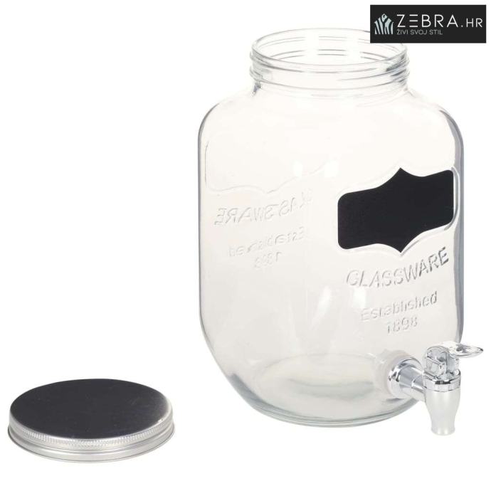 Napravljen od prozirnog stakla, dozator odiše jednostavnim i čistim izgledom, omogućujući vam lako nadgledanje i prepoznavanje pića. Široki otvor osigurava jednostavno i brzo stavljanje ili vađenje pića. Zahvaljujući poklopcu koji se pričvršćuje, staklena posuda dobro se zatvara, što osigurava da vaša pića duže ostane svježa. Uz to, ugrađena slavina olakšava vašim gostima da se sami posluže na zabavi.