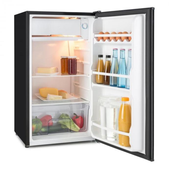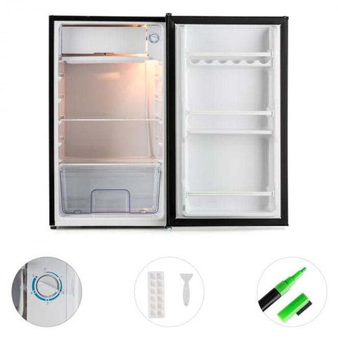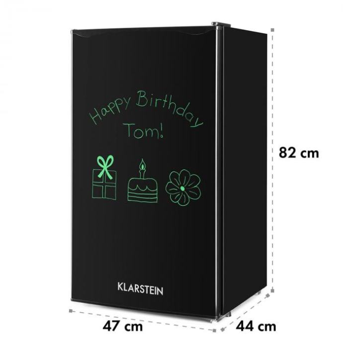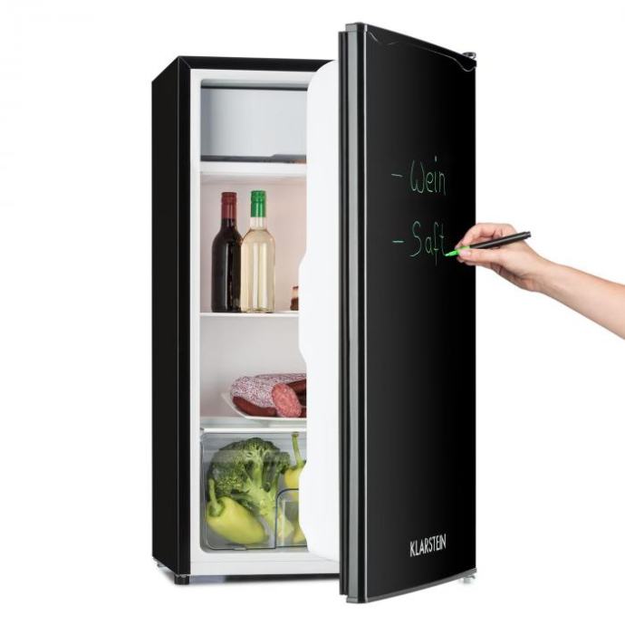 Komapktan hladnjak kapaciteta 90 l, crnog dizajna pogodan za manja kućanstva. Dvije staklene police, kutija za voće i povrće, tri police na vratima i zamrzivač, osiguravaju preglednu organizaciju namirnica. Energetski učinkoviti hladnjak, energetskog razreda A+, štedi okoliš i Vaš novčanik. Kompaktna oprema u mala kućanstva: hladnjak Klarstein Spitzbergen Uni nudi mjesto za sve namirnice koje treba hladiti ili zamrznuti. Objem od 90 l je dovoljan za mala kućanstva za jednu ili dvije osobe, ali također i kao hladnjak za vikendice, podrume ili radionice. Energetski razred A+ dodatno štedi ne samo okoliš nego i Vaš novčanik. Nije važno želite li spremiti sok, mlijeko, sir, kobasice ili povrće: u hladnjaku Spitzbergen Uni ćete imati savršeno organizirane namirnice. Dvije staklene police sa zaštitnim plastičnim rubovima osiguravaju lijpo organiziranje namirnica. Pića i jaja će naći mjesto na tri praktične police na vratima. Prozirna kutija nudi dovoljno prostora za voće i povrće. Zamrznuta pizza, krumpir ili piletinu možete odložiti u zamrzivač. Nema više dugotrajnog traženja namirnica! Hladnjak Spitzbergen Uni od Klarsteina nudi preglednu organizaciju namirnica. Magične novosti: Posebnom osobinom Klarstein SPITZBERGEN Uni hladnjaka su vrata na koja možete pisati (i brisati). S Magic Markerom možete zapisati vrijeme sastanka ili pak ljubavne poruke direktno na hladnjak. Upozorenje: prilikom isporuke kemijska olovka je suha. Pritisnite vrh kemijske olovke, kako biste aktivirali protok boje
