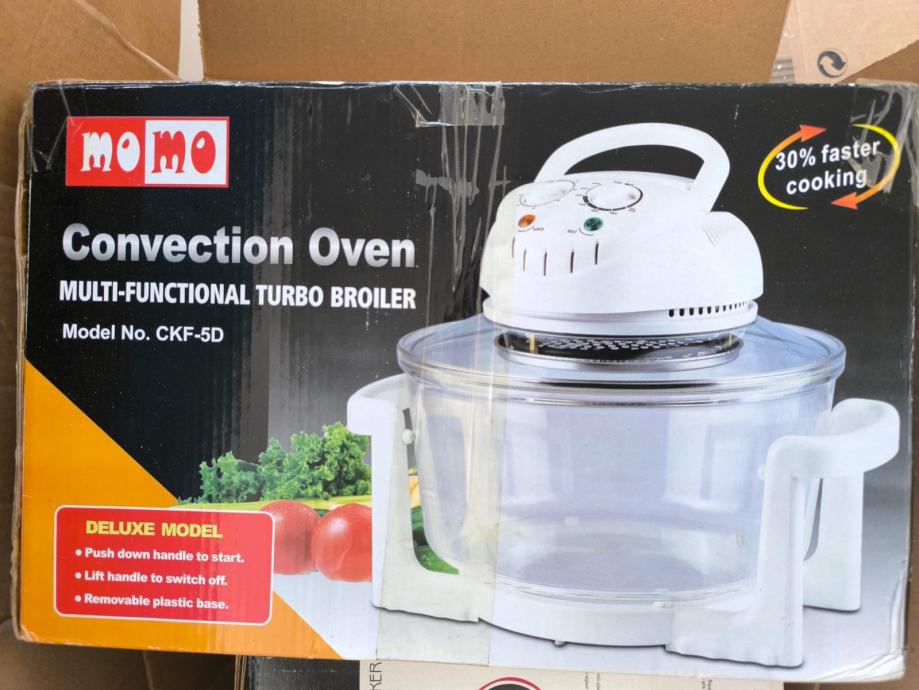 Prodajem NEKORIŠTENU konvekcijsku pećnicu Momo CKF-5D, 220V-240V, 50 Hz, 1300W. Kutija samo otvorena da se pregleda paket, od tada stoji netaknuta. Idealna za pripremanje hrane bez dodataka masnoće. U obliku posude od vatrostalnog stakla, štedi do 30% struje u odnosu na obične pećnice, služi kao zamjena za standardnu peć, grill, kuhalo, toster, električni roštilj itd., kapacitet 11 litara.