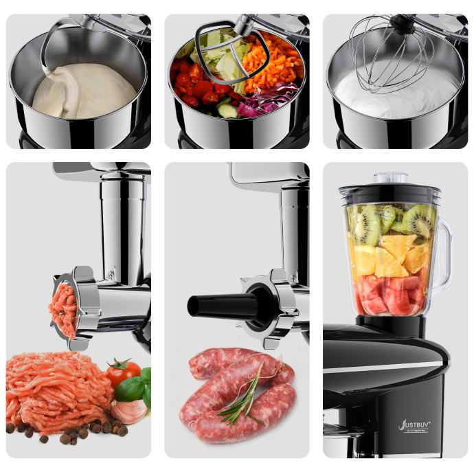 ✓ Set dodataka: Posuda od nehrđajućeg čelika od 5,5 l nudi dovoljan kapacitet. Uključeni su višenamjenski dodaci: kuke za tijesto, ravna metlica, žičana pjenjača i zaštita od prskanja koji vam pomažu da dodate sastojke bez stvaranja nereda.