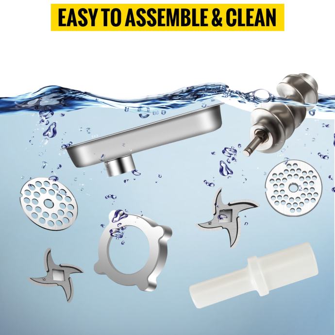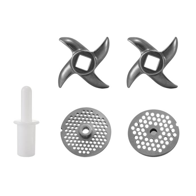 Uz mašinu dolaze 2 šajbe od 6mm i 8mm, 2 noža i ostali pribor koji je na slici. Dimenzije su 37cm x 22cm x 42cm.
