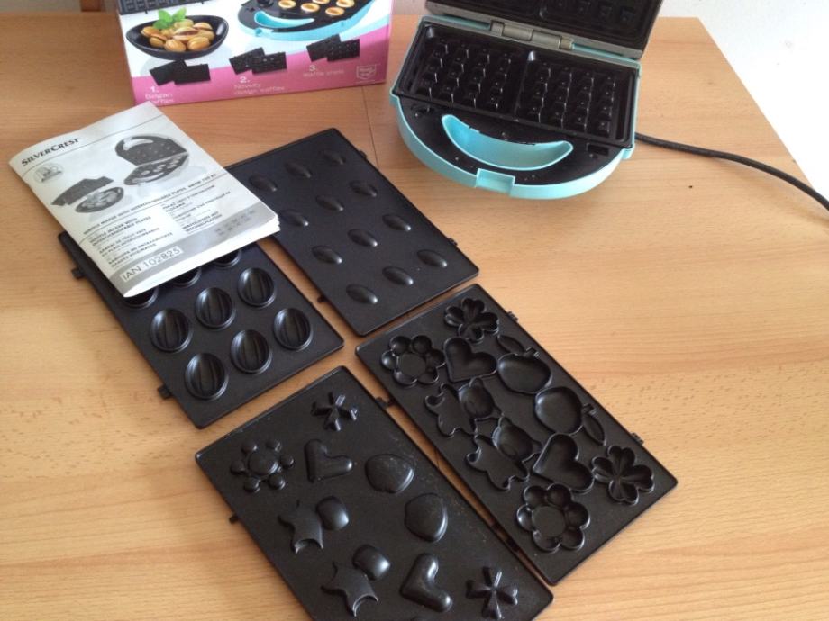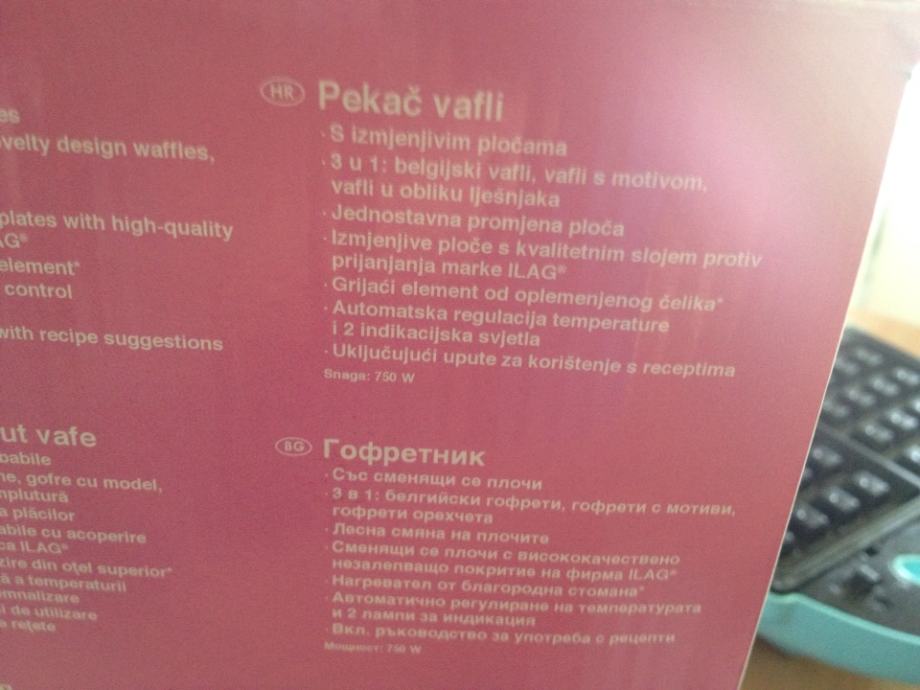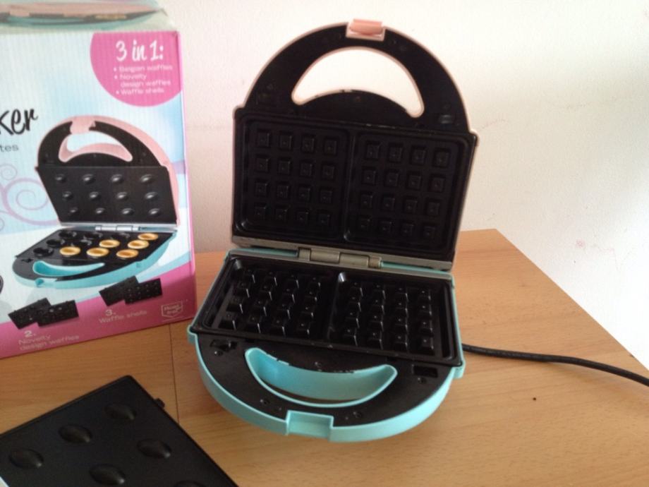 Prodaje se doslovno jednom korišteni pekač za belgijske vafle. Dolazi s kompletno očuvanom ambalažom i knjižicom uputstva i recepata te dodatnim nastavcima (školjkice i djecji oblici) u originalnoj kutiji.