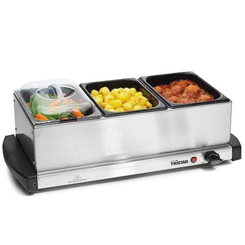 Kupite Poslužavnik za Buffet | Tristar BP2979 po najboljoj cijeni. Poslužavnik za buffet s kapacitetom za grijenaje 3 jela i funkcijom podgrijavanja jela. Tri zasebne posude s poklopcima. Održava vaša jela toplima. Podesivi termostat od 200 W. Značajke:Kućište od negrđajućeg čelikaRegulator temperature po razinamaEmajlirani pladnjeviVruća pločaTermootporno kućišteUgrađene ručkeSvjetlosni indikatori uključenjaSnaga: 200 W