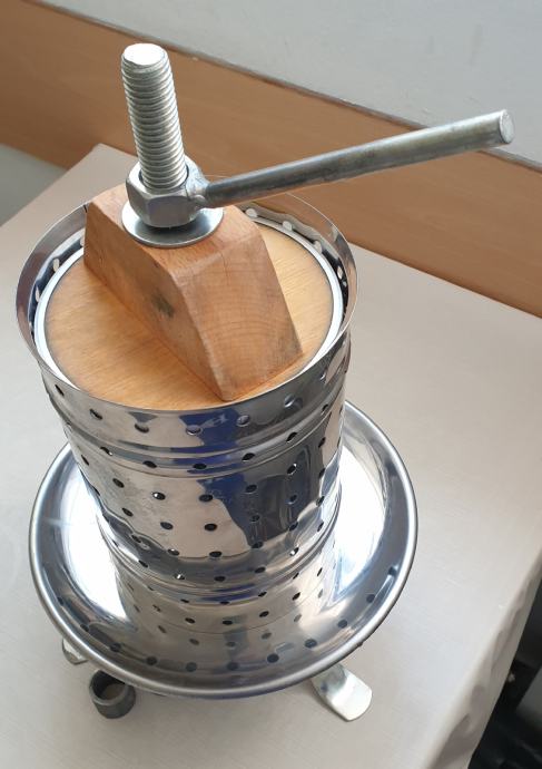 Preša za čvarke od inoksa, zapremine cca 3 l, korištena, ali ispravna, pomični drveni dio presvučen inoksom.